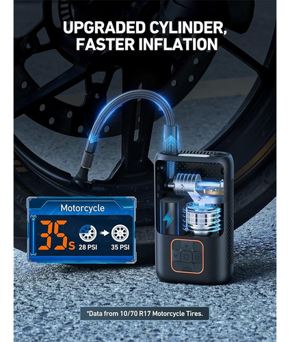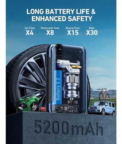 Inalámbrica y compacta: Esta bomba de aire inalámbrica tiene un peso inferior a una libra (0.98 libras) y cabe en la palma de su mano, facilitando su almacenamiento en un automóvil, cesta de bicicleta, bolsillo o mochila. Su diseño inalámbrico permite un inflado instantáneo en cualquier momento y lugar. | Cilindro mejorado e inflado más rápido: Equipada con un motor de alto rendimiento mejorado, esta potente bomba de neumáticos proporciona un inflado rápido. Solo se necesitan 35 s para inflar un neumático de motocicleta (10/70 R17) de 28 PSI a 35 PSI. | Modo inteligente 4 + N y 4 unidades: Cuenta con 4 modos de inflado preestablecidos (automóviles, motocicletas, bicicletas, pelotas), ideales para principiantes. Incluye un modo personalizado que permite el ajuste manual de la presión de 3 a 150 PSI. Ofrece cuatro unidades de presión diferentes kPa, PSI, Bar y kg / cm2 para elegir, facilitando su operación para todas sus necesidades de inflado. | Batería de larga duración y 3 modos LED: La bomba de aire portátil inteligente no necesita una fuente de alimentación externa, con sus baterías de 2-2600 mAh, puede inflarse continuamente durante 25 minutos.