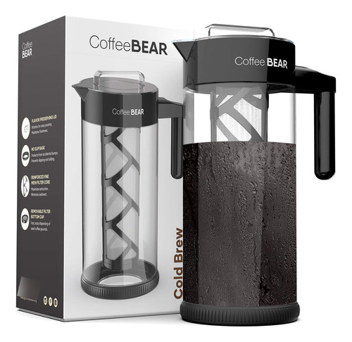 Prepara café suave y de sabor rico que es menos ácido con la cafetera Cold Brew de Coffee Bear. Diseñado para hacer que la preparación en frío sea muy fácil, te permite hacer tu propia cafetería, el mejor café en frío en casa. Cafetera de vidrio duradera y resistente a los golpes La jarra está hecha de vidrio de borosilicato resistente con una base de silicona antideslizante de grado alimenticio que no contiene BPA. Esto sirve como un cojín contra golpes accidentales. Nuestra jarra infusora también tiene un mango de fácil agarre. Bloquea la frescura y el sabor. Su tapa conserva los delicados sabores de tu café minimizando la exposición al aire. Puedes almacenar tu infusión durante días y no se volverá rancia. Para abrir, simplemente gira ligeramente hacia la izquierda o hacia la derecha, exponiendo la boquilla con un diseño de vertido inteligente. Esto garantiza un vertido limpio y sin desorden cada vez. Con filtro de malla ultrafino reforzado. El filtro de malla de grado alimenticio puede contener 3.53oz de café molido. Su estructura de nervadura única y resistente al desgarro hace que sea más resistente. A diferencia de los filtros de acero inoxidable, no se oxida y está libre de componentes químicos que destruyen el sabor natural de tu café. Obtén un libro electrónico de recetas con tu compra Recibirás un libro electrónico con 5 recetas gourmet de un chef profesional. Además, también hay un manual a todo color que cubre el cuidado y el uso adecuados de tu cafetera fría.