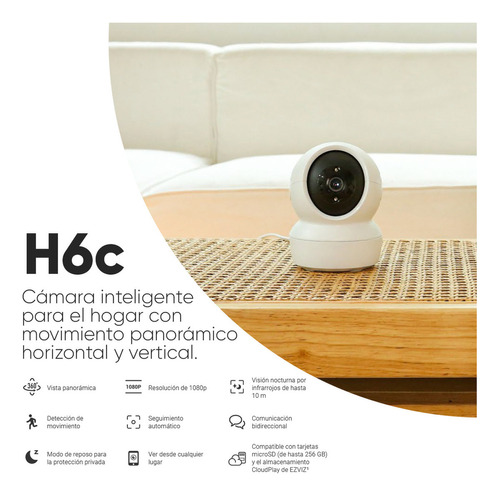 Es hora de que actualice su cámara de seguridad para que ofrezca una visión más nítida y actúe de forma más inteligente. Esta nueva versión de la exitosa gama de cámaras interiores de EZVIZ cuenta con una impresionante calidad de vídeo en FULL HD y mejora la función de detección con IA integrada. Al ser una sencilla cámara de fácil conexión, la H6c 1080p puede ser su cámara de confianza para el hogar o el monitor para bebés y mascotas de cualquier habitación.