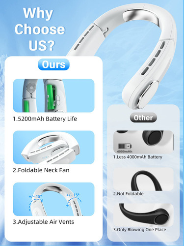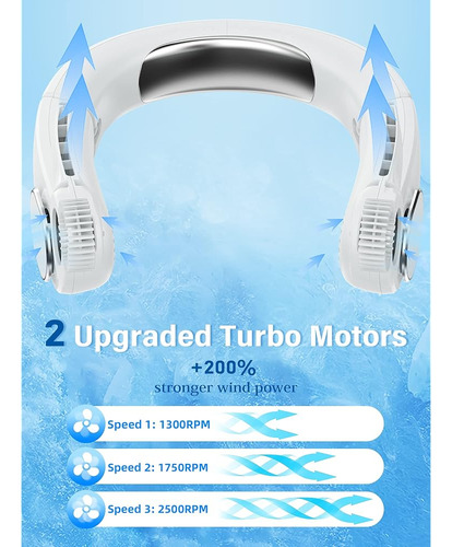 4. Enfriamiento rápido y flujo de aire personalizable: experimenta un enfriamiento más rápido con nuestra exclusiva salida de aire de turbina patentada, que aumenta el área de salida de aire en más del 90 en comparación con los ventiladores de cuello tradicionales. Personaliza tu experiencia de refrigeración con los ajustes de 3 velocidades del ventilador de cuello.