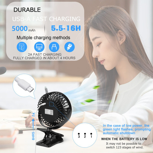 Con una gran capacidad de batería mAh, este ventilador alimentado por batería tiene una vida útil súper larga de 5.5 a 20 horas dependiendo de las 3 configuraciones de velocidad disponibles. El ventilador se puede cargar fácilmente a través de USB desde una computadora, un banco de energía o un cargador USB.