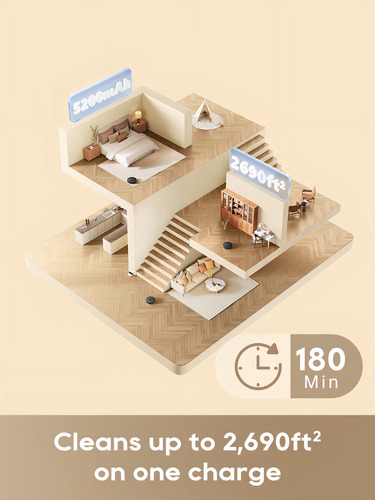 La batería de alta capacidad de mAh ofrece un tiempo de funcionamiento extendido de 180 minutos, lo que le permite limpiar hasta pies cuadrados con una sola carga, haciendo que sus sesiones de limpieza duren más tiempo.