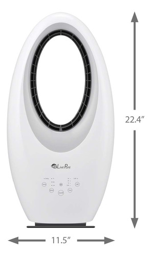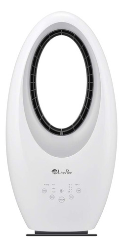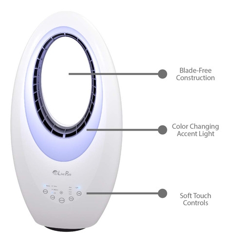 LivePure LPFAN es un ventilador oscilante sin aspas para toda la habitación. Viene con un control remoto, temporizador de sueño, y luz de acento. Su color es blanco perla.