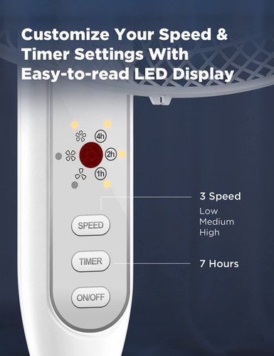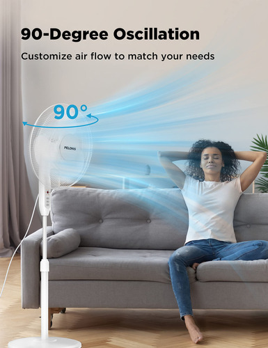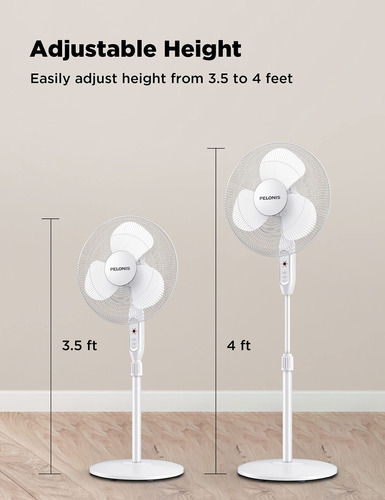 El ventilador de pedestal Pelonis de 16 pulgadas cuenta con un motor potente y cuchillas de alta calidad que hacen la refrigeración más eficiente y ahorran energía. Con 3 ajustes de velocidad y temporizador de 7 horas con apagado automático, es ideal para áreas medianas a grandes, generando un fuerte flujo de aire y operando a bajo nivel de ruido.