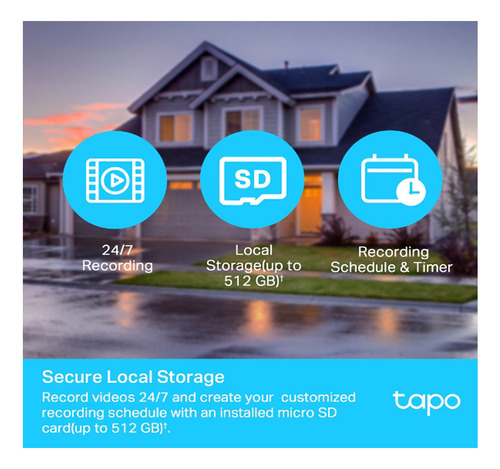 • Flexibles opciones de almacenamiento: Guarde los videos grabados en una tarjeta microSD instalada (hasta 512 GB), o utilice el servicio de almacenamiento en la nube Tapo Care.