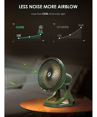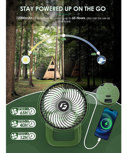 Este ventilador de campamento está equipado con una gran duración de batería de mAh, respaldo de hasta 65 horas que también se puede utilizar como un banco de energía salida 5V1A que es la herramienta definitiva para aquellos que necesitan mantenerse conectados y productivos, cargar tu teléfono, tableta cuando estás lejos de una toma de corriente y nunca te quedes sin jugo.