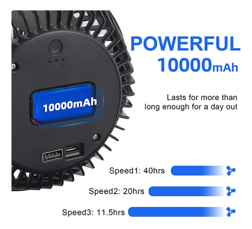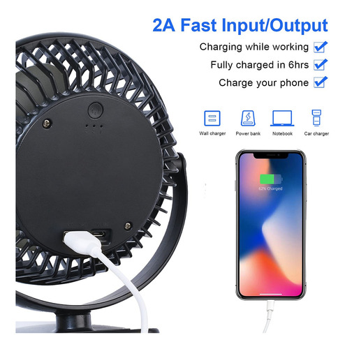 Ventilador con batería de mAh: equipado con una batería recargable de mAh, este potente mini ventilador puede durar de 11.5 a 40 horas dependiendo de las diferentes velocidades cuando está completamente cargado. Más largo que cualquiera de los otros ventiladores portátiles de tamaño comparable. La entrada y salida actualizada de 5 V2 A garantiza una recarga completa rápida en 6 horas. Este pequeño ventilador puede cargar cómodamente tu teléfono u otros dispositivos electrónicos cuando lo necesites.