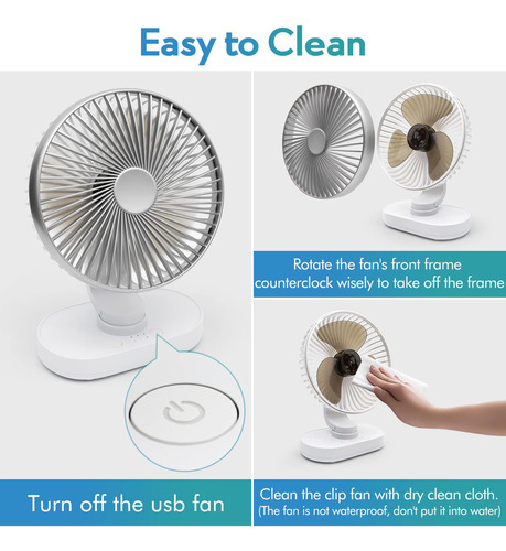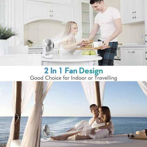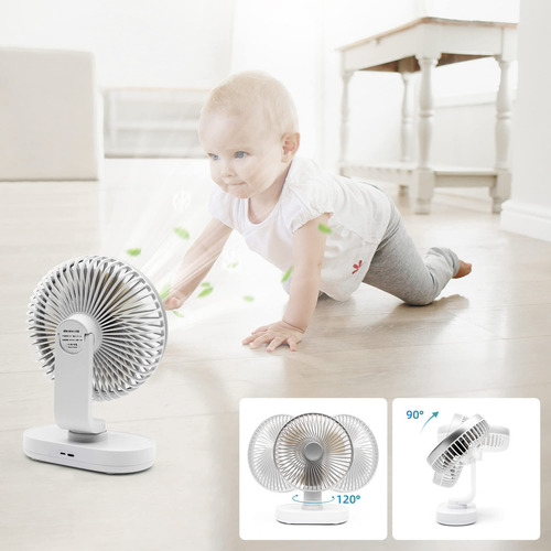 Este ventilador de escritorio oscilante y portátil cuenta con una batería de larga duración que se puede recargar fácilmente conectándolo a una fuente de alimentación móvil, laptop o fuente de alimentación de automóvil. Puede durar hasta 15 horas después de estar completamente cargado dependiendo de la velocidad.