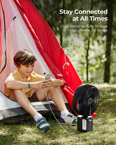 Control remoto: El producto viene con un dispositivo de control remoto, lo que te permite operar cómodamente todas las funciones del ventilador desde una distancia. También puedes utilizar la batería de respaldo del ventilador para cargar el teléfono u otros dispositivos en una emergencia.