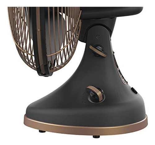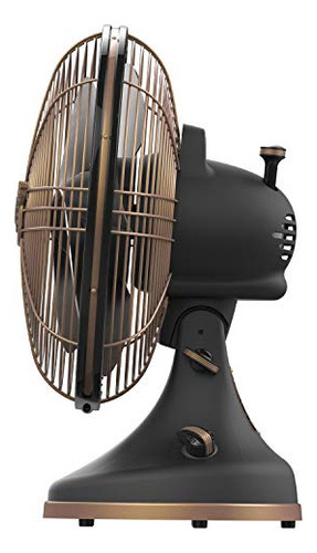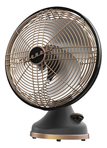 Este ventilador de diseño vintage cuenta con acabados de lujo. Su construcción de metal duradero está realzada con acabados de plomizo mate y detalles de cobre, equilibrando el estilo art deco y la sofisticación.